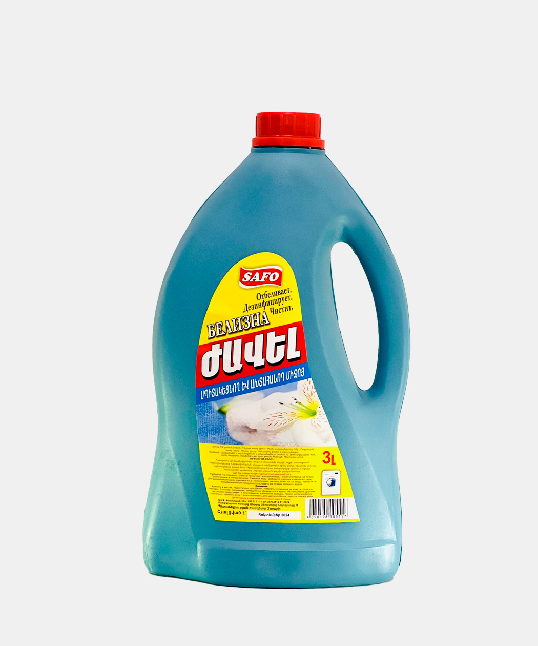 Ժավել ավտոմատ Safo բելիզնա 3 լ — Բաղադրությունը` Մակերևույթային ակտիվ նյութեր, նատրիում հիպոքլորիդ 2.5%, ջուր: Նախատեսված է ձեռքով և ավտոմատ լվացքի համար: Ավտոմատ լվացքի ժամանակ դնել նախնական լվացքի ռեժիմի վրա: Լվացքի փոշին լցնել հիմնական լվացքի արկղում լցնել 120 գր սպիտակեցնող միջոցը: Ձեռքով լվացքի ժամանակ 60 մլ սպիտակեցնող հեղուկը խառնել 15 լ ջրին և թողնել 60 րոպե: Պահել հեռու երեխաներից, աչքերին թափվելու դեպքում լվանալ ջրով և դիմել բժշկի: Պիտանելիության ժամկետը 2 տարի: Չի կարելի օգտագործել բրդյա, կաշվե իրերի գունավոր հագուստի համար: